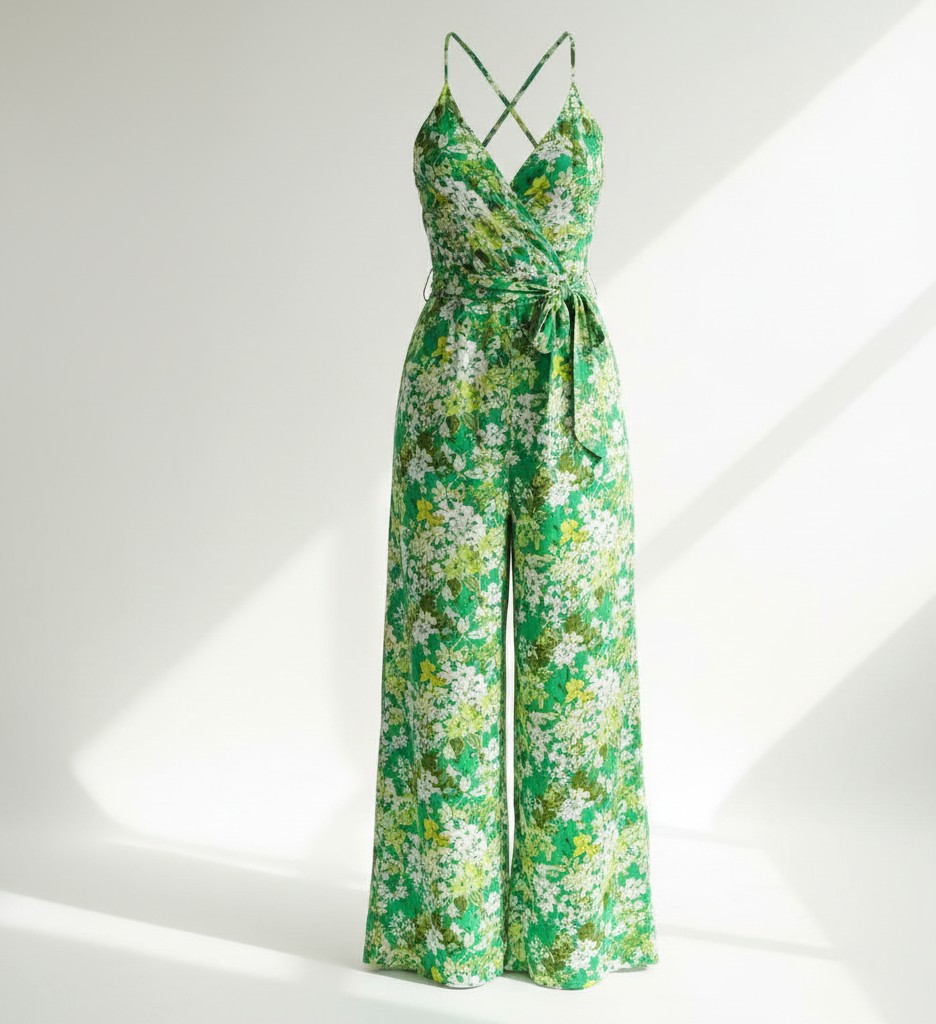 Este mono combina un escote cruzado con espalda abierta y tirantes cruzados, acompañado de un lazo regulable, creando un diseño armonioso y equilibrado. El estampado floral en tonos verdes aporta un detalle distintivo, mientras que la pierna ancha mantiene una caída elegante. Una opción destacada para vestuario veraniego y ocasiones informales.